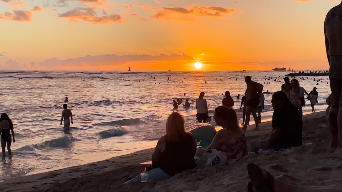 Albert, putting his arm around my shoulders and drawing me closer to him as the glow of the horizon turned red with the sunset at Kuhio beach. People were splashing about in the rolling waves. There was an Asian girl making a dragon sand animal with such determination you would’ve thought there was a prize to be won. We ate dinner sitting on my sarong, which I’d spread over the sand. It was poke from Foodland, which we’d gone to because we’d wanted to save money. But I ended up blindly buying the most expensive fresh fish, which ended up costing us a $40 bill from what’s usually a cheap grocery store. We laughed at our inside joke, that I always blindly pick out the most expensive things to buy wherever we go. A man behind us shouted, “Goodbye, Sun! See you tomorrow!” as it set. The sky was so high above. It was a soft purple that was lapping up the last golden rays of the day. Diamond Head was standing tall and proud in the distance to the left. Albert was sitting right next to me on my right.