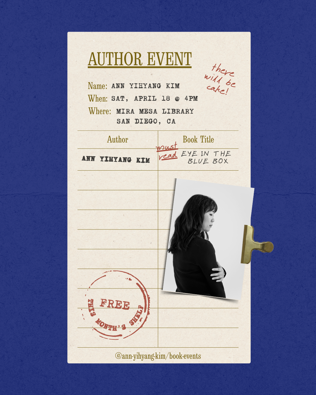You are invited to my very first author event! Join me as I talk about my debut novel, Eye in the Blue Box! I’ll read a bit of my book, talk about its creation, and do a giveaway as well as a Q&A with the audience, you! I’ll also sign books. It’s a free event, and I hope to see you there.